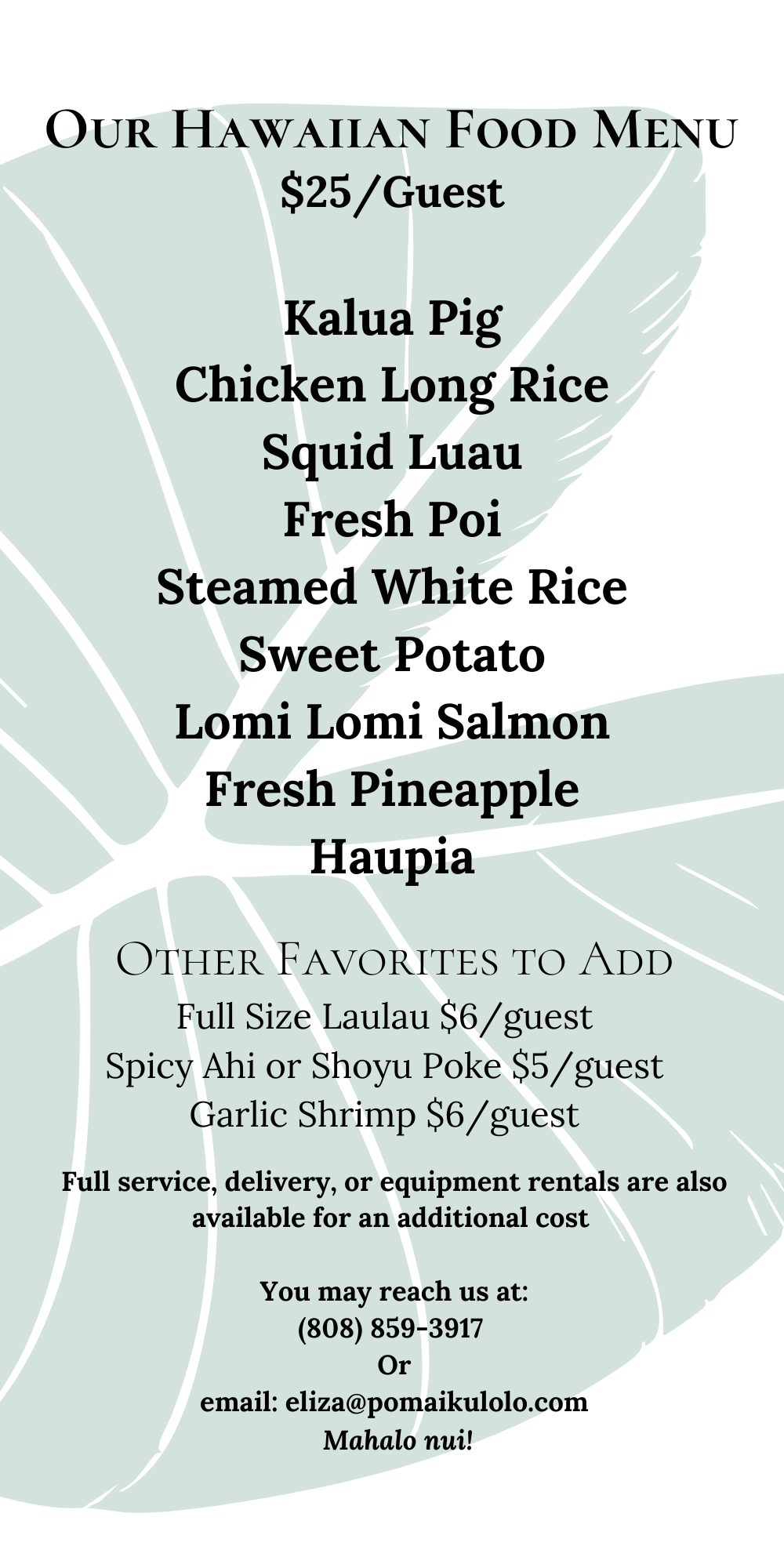 We also offer other favorites like Poke, Laulau and Garlic Shrimp. Please let us know how we can help.